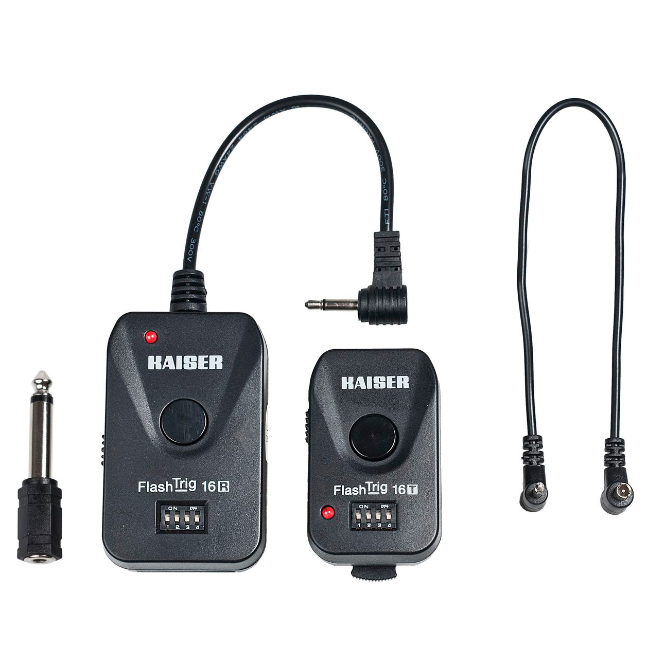 Med lavt strømforbrug og lang driftstid er Kaiser Flash Trigger 16 perfekt til lange fotosessions. Den indbyggede testfunktion giver dig mulighed for at kontrollere opsætningen uden at affyre kameraet. Der medfølger 23A/12V batteri til transmitteren – receiveren kræver 2 x AAA-batterier (medfølger ikke).