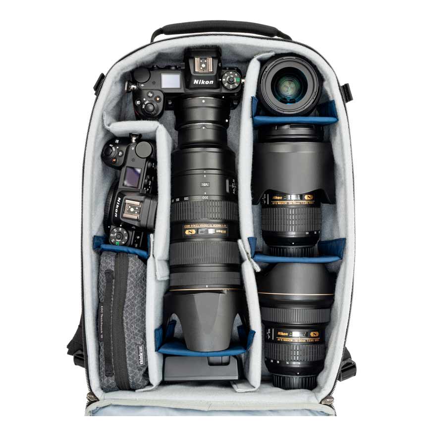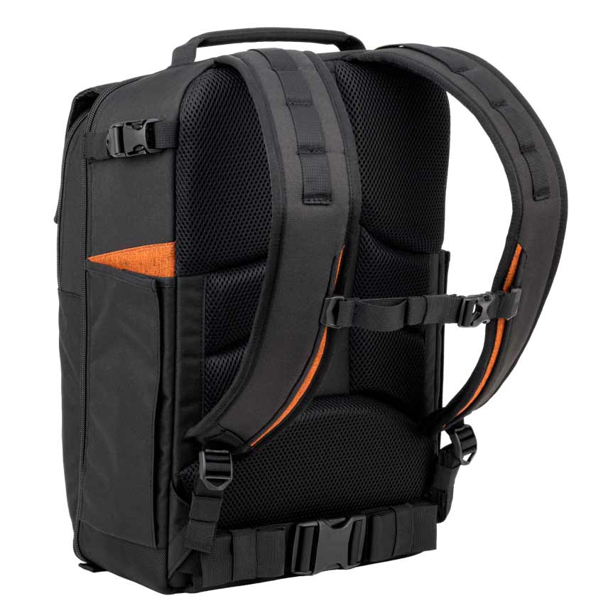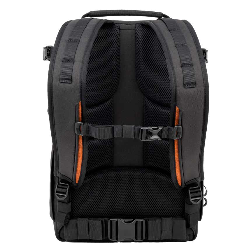 Med et rummeligt 18-liters hovedrum og justerbare, polstrede skillevægge kan tasken rumme et spejlløst kamera med 2 objektiver og en flash, samtidig med at du har plads til personlige ejendele. En skumpolstret laptop-lomme passer til en 14" bærbar computer, og frontpanelet åbner helt, så du hurtigt og nemt får adgang til hele dit udstyr.