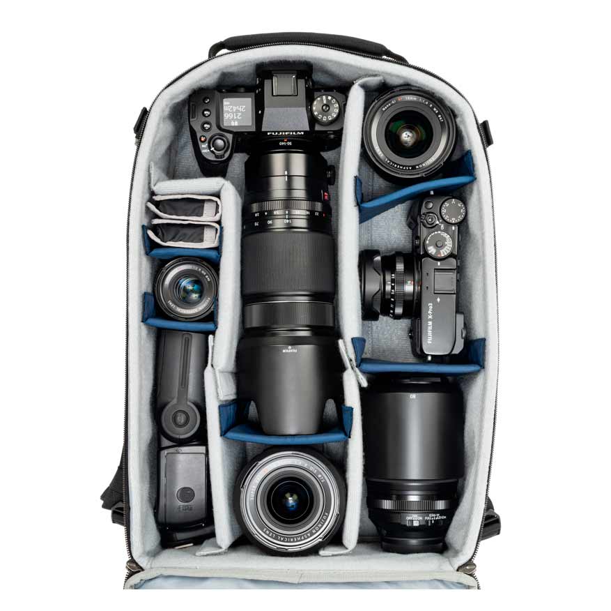 De højkvalitets YKK RC-lynlåse, det anatomisk designede rygpanel og de polstrede skulderstropper med brystrem og hoftebælte sikrer høj komfort og holdbarhed – også under lange ture. Tasken har også en 5L frontlomme til f.eks. en let jakke, ekspanderbare sidelommer til vandflaske eller stativ, og et regnovertræk til våde forhold. Den flade bund gør, at tasken kan stå selv, og det vægtcentrerede tophåndtag giver god balance.