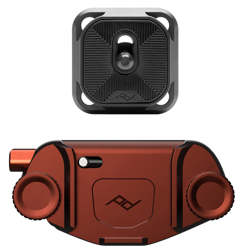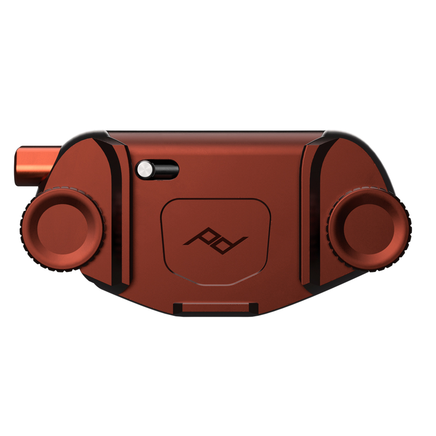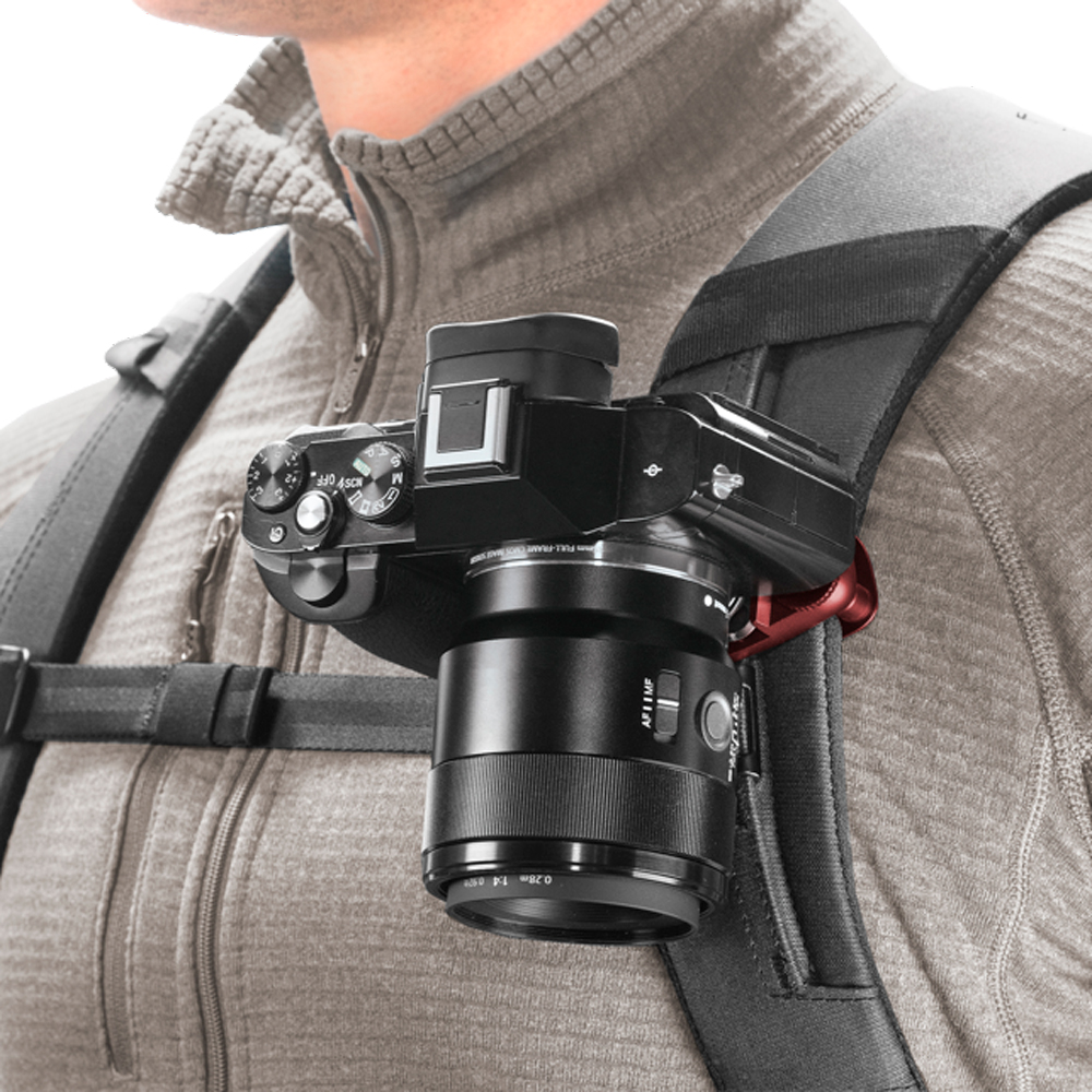 Capture v3 består af en kraftig metalklemme, som fastgøres til din rygsækrem, et bælte eller en taske, og en standard stativplade, som skrues i bunden af dit kamera. Når kameraet er sat i klemmen, låses det fast med en klikmekanisme og kan kun frigøres ved tryk på den låsbare udløserknap. Denne knap er testet til at tåle tryk på over 90 kg – det giver maksimal sikkerhed.