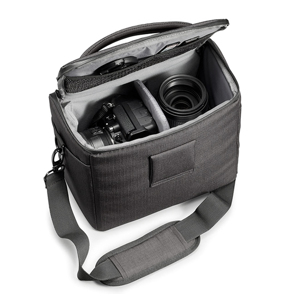 Det rummelige hovedrum med justerbare skillevægge tilpasses nemt et DSLR eller systemkamera, 1–2 objektiver og småting. Indvendigt finder du to mesh-lommer i låget samt en ekstra mesh-lomme i hovedrummet, der holder batterier, hukommelseskort og kabeladaptere på plads. Udenpå får du en frontlomme med lynlås og udvidelsesfold til hurtige småting samt to sidelommer.