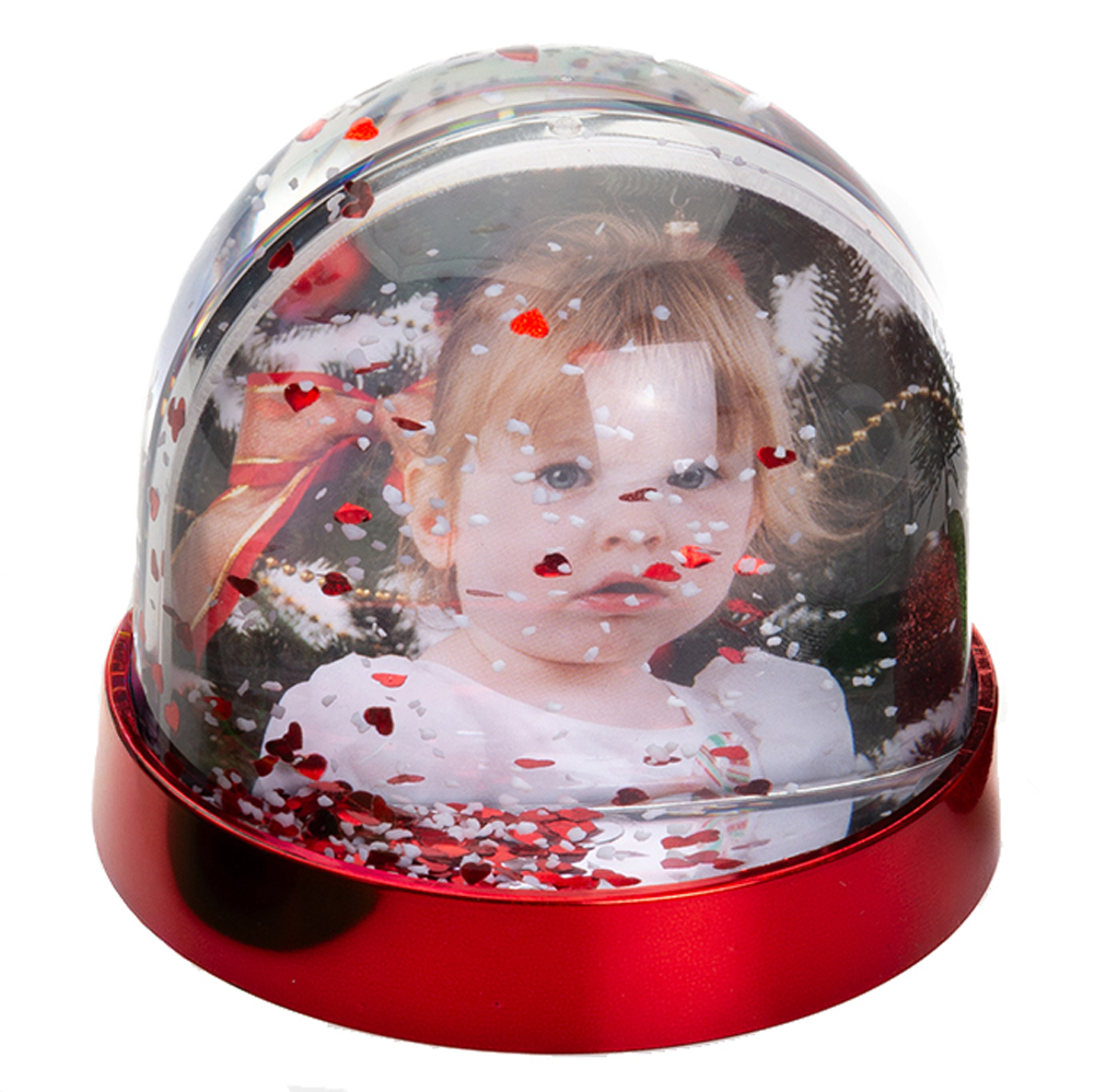 Lav en personlig gave med denne snekugle med røde hjerter og snefnug! Der er plads til billeder på begge sider (7,2 × 8,6 cm), som du selv klipper til og indsætter. Når du ryster kuglen, daler sne og hjerter ned en romantisk og sjov gaveidé til jul, Valentinsdag eller som minde om en særlig person.