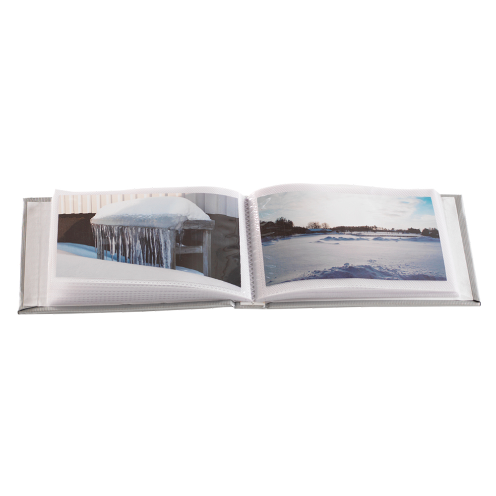 Albummet er bogbundet og har et moderne udtryk med en mat, sort overflade. De ekstra kraftige omslag beskytter dine billeder effektivt, mens de klare fotolommer gør det nemt at indsætte og udskifte billeder uden brug af lim eller tape.