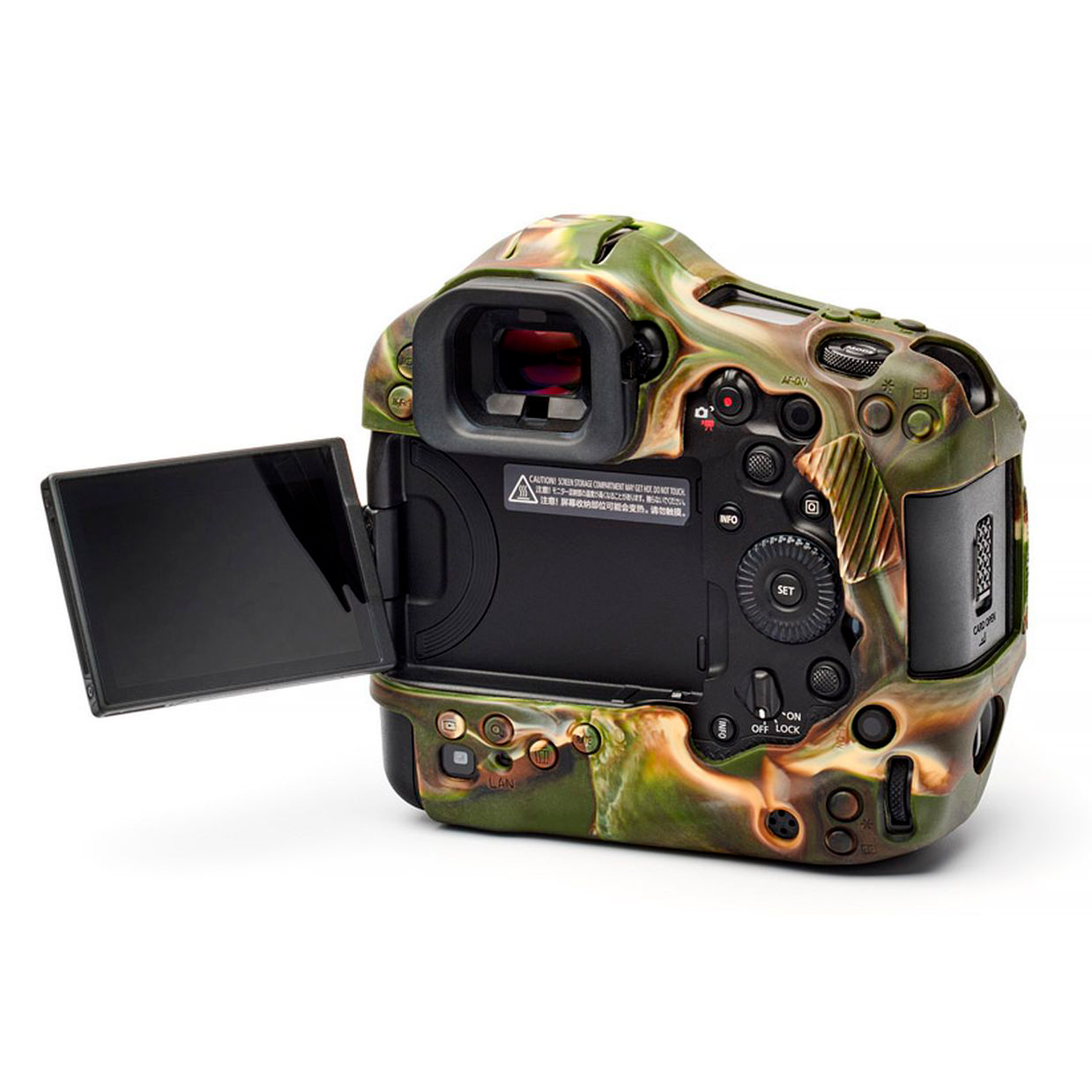 easyCover silikone-cover til Canon R1 Camouflage beskytter kamerahuset mod stød, ridser, sand og støv uden at hindre betjeningen. Den skridsikre overflade giver et sikrere greb i regn og kulde, og alle porte, knapper, hjul, batteri-/kortslot, søger, hotshoe og stativgevind er fortsat let tilgængelige. Monteres på sekunder træk blot coveret over.